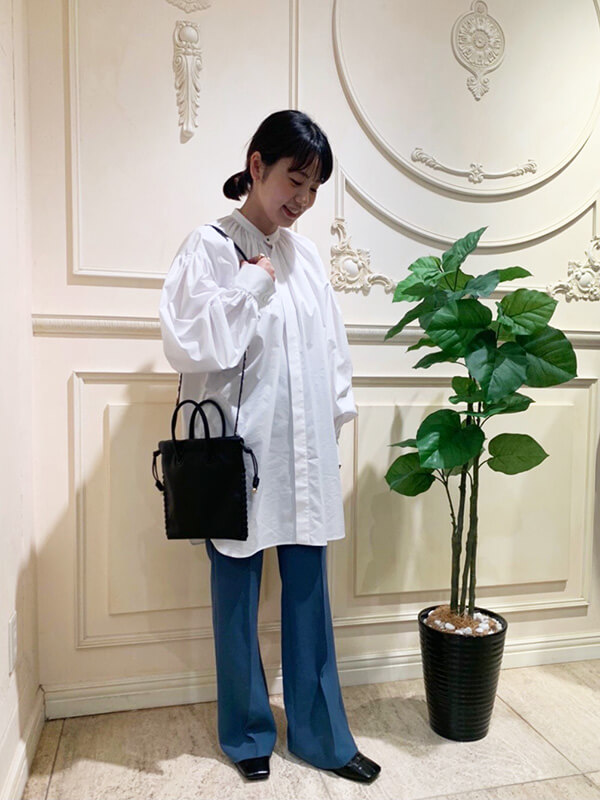 今年らしいボリュームのあるシャツにブルーカラーのフレアパンツに合わせて、バッグはミニバッグにしてバランスの取れたハンサムコーデの完成です♡