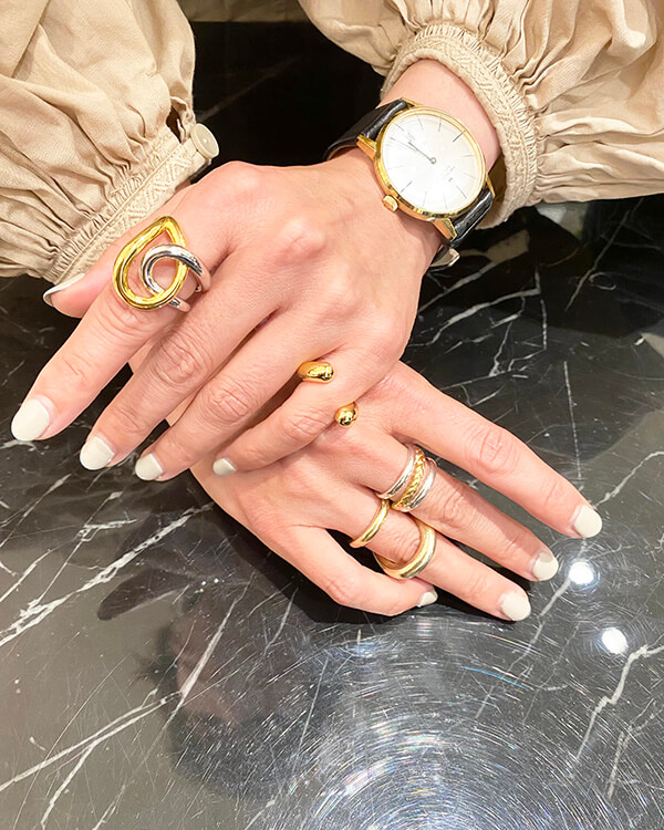 それを基準に強弱がつくようなリングを選んでいます。艶なしや刻みなど表面の質感で変化をつけつつ、シルバーで統一してまとまりを持たせています!」