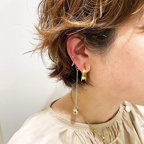 「遊び心を足したくて星型のイヤカフにボールチェーンを組み合わせてオリジナルデザインにしてみました。長いタイプを付けるときは長さのコントラストがつくように強弱をつけて選んでいます。」