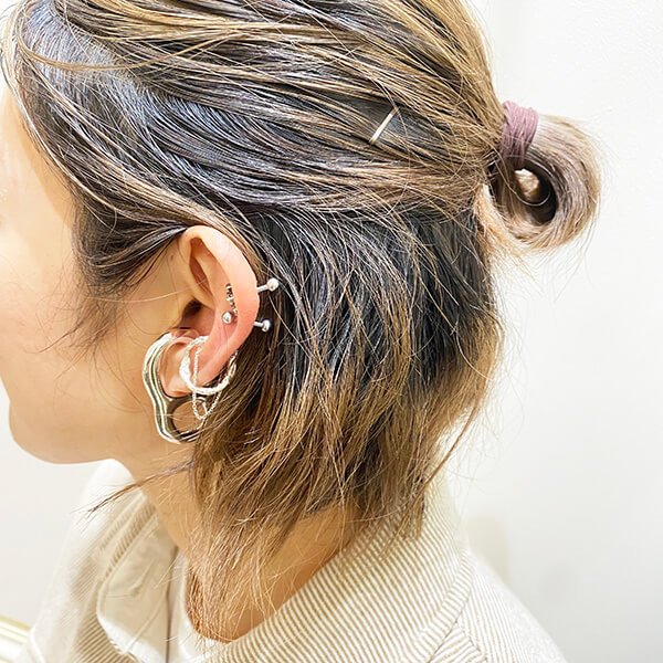 「自分の耳の大きさ、形を生かしてイヤークリップと3連のイヤーカフでモードな耳元に仕上げました。耳元スタイリングはまずは自分の耳のサイズ感や厚みに適したものを選ぶことです!いくらデザインが良くても相性が悪ければ付けたい位置にフィットしません。」