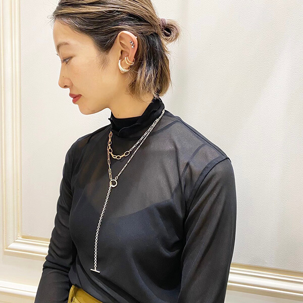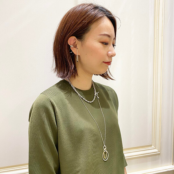 「ショートネックレスのマニッシュな雰囲気も良いですが、ロングをプラスすることで女性らしさをプラスできます!シンプルなニットに映えるチェーンネックレスのバリエーションが豊富な今季は重ね付けを楽しんでください!」