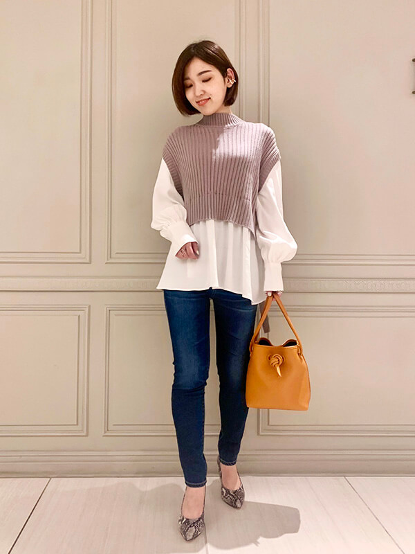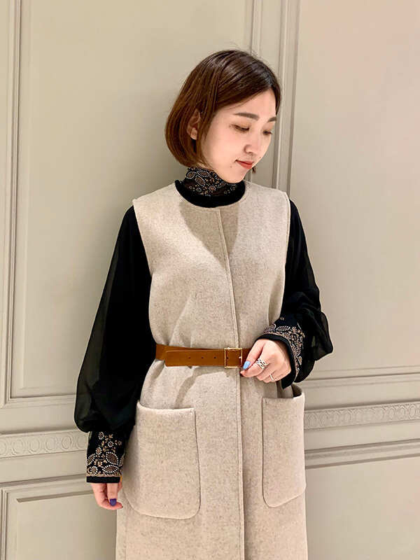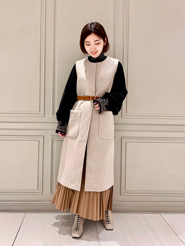 続いてのスタイリングは、YOKONUMAさんも紹介していた PARIGOTオリジナルのジレを使用したレイヤードスタイル!