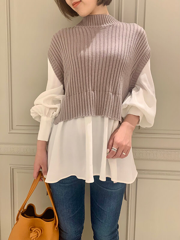 こちらは、ニットがドッキングされたシャツブラウス。一着でレイヤードしたようなこなれ感が叶う優れもの!