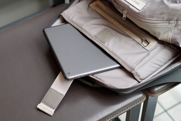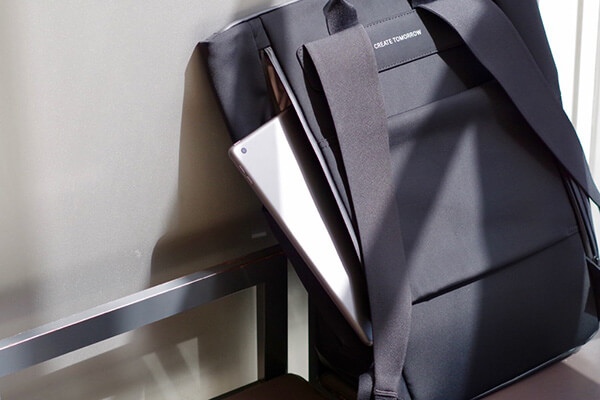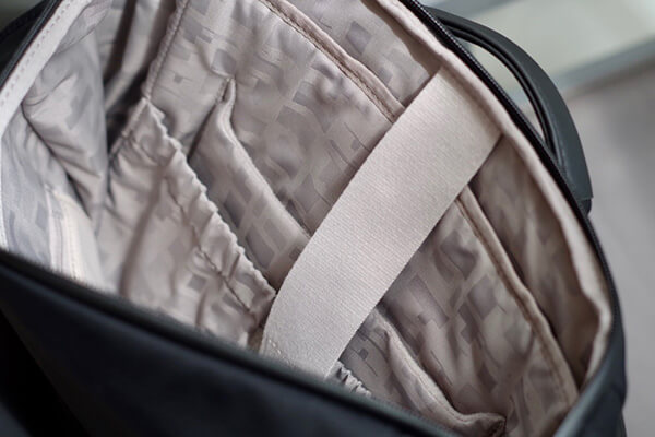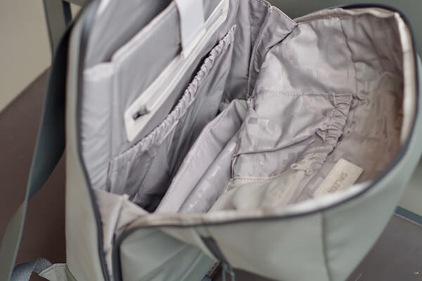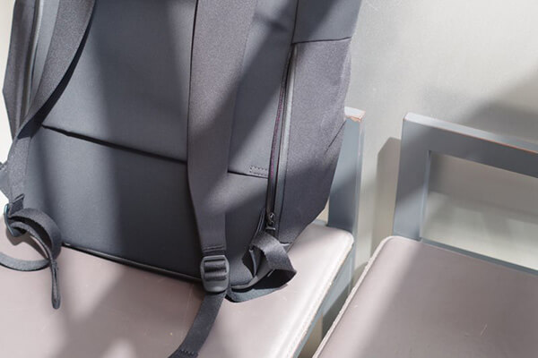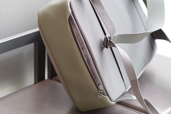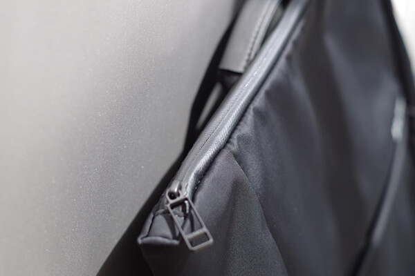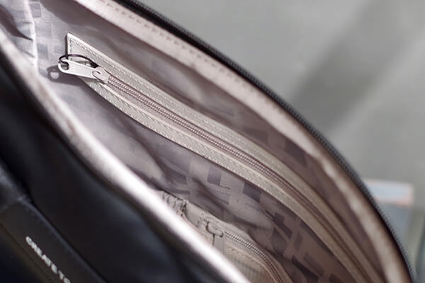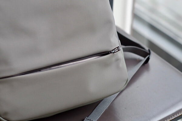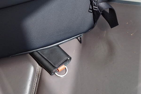 すべてのバックパックの底面にはファスナーポケット(シークレットポケット)が付いています。外出先でもバックパックを背負ったままアクセス可能で、スマートフォンや鍵、財布などを入れるのに十分なスペースを確保しています。旅先でのスリ対策をふまえ、気づかれにくい底面に設計されています。
