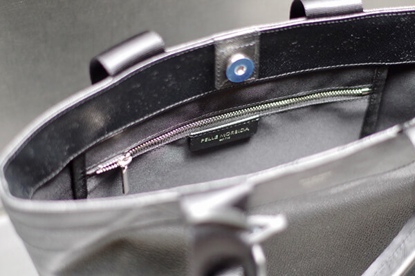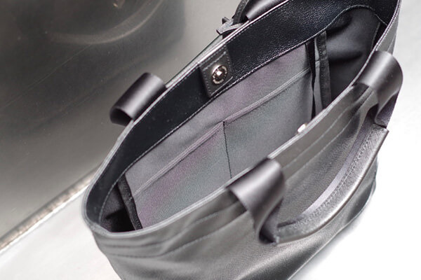 内装にはファスナー付きポケットが1つと小物用のポケットが2つ備わっており、スマートフォンやメモ帳などの収納に便利です。