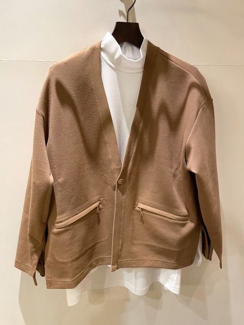 カーディガンは胸元にかなりスペースが出来るので、写真のようにハイネックのアイテムと合わせるのがオススメです。