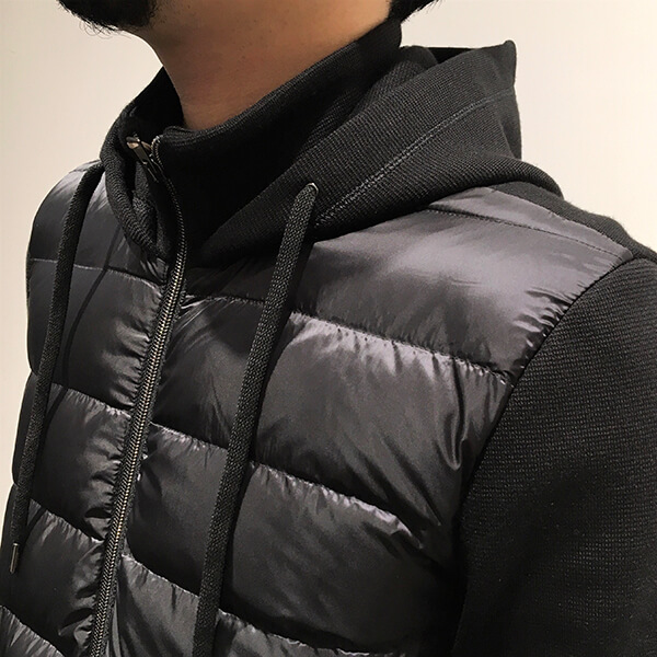 パーカー=スウェット素材が定番ですが、こちらのモデルの本体の素材には、布帛のように見えるKNIT EFFECT(ハリと弾力のあるウールコットンミラノリブ)が採用されております。そこにヘルノの代名詞である非常に軽量なNYLON ULTRALIGHT(20デニールのウルトラライトナイロン)を組み合わせ、インジェクション仕様でダウンを直接注入することにより、パーカーにダウンベストを重ねたようなフェイクレイヤードルックが生み出されています。