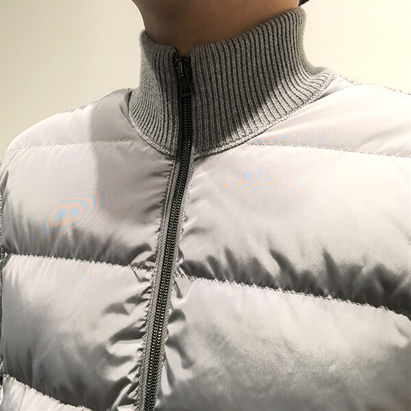 こちらは、シンプルなボマーブルゾンタイプのデザインを、ダウン×5ゲージフィッシャーマンリブで表現したヘルノのハイブリッドブルゾンです。