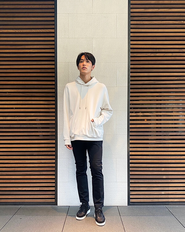 パーカーもシンプルでゆったりしたサイズジングを選べば、デニム+パーカーのカジュアルコーディネートも雰囲気のあるスタイリングに仕上がります。