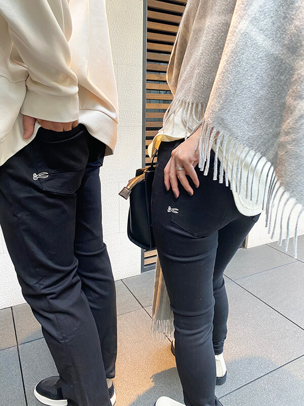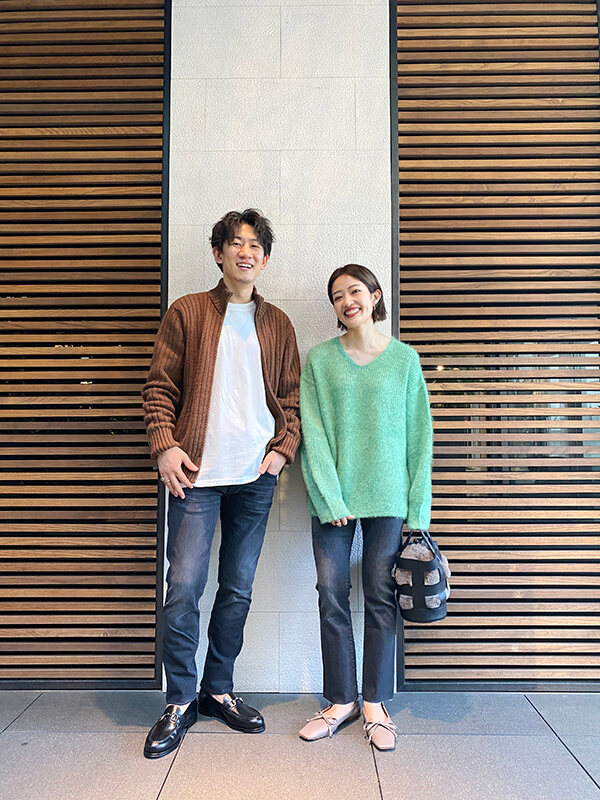 メンズはスリムテーパード、レディースはフレアデニムと同色見えしながらも形で変化をつけるのもテクニック。