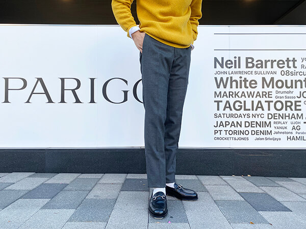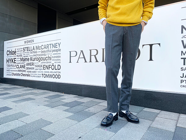 グレーのパンツでトップスが引き立つようスタイリングしました。