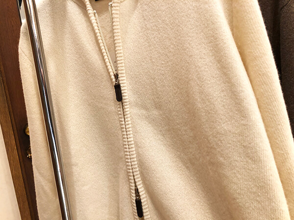 ご紹介するのはジップアップニットパーカ。ダブルジップの引手には某ブランドを思わせる高級感のあるレザーが使用されており、上品かつカジュアルな印象に。