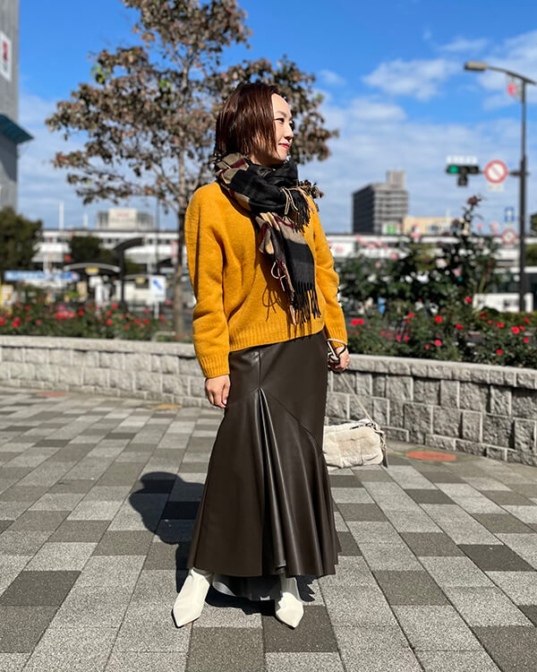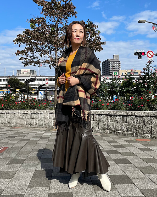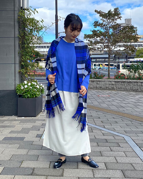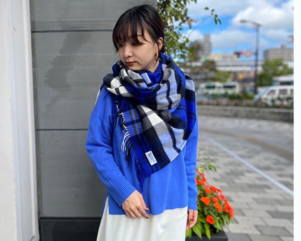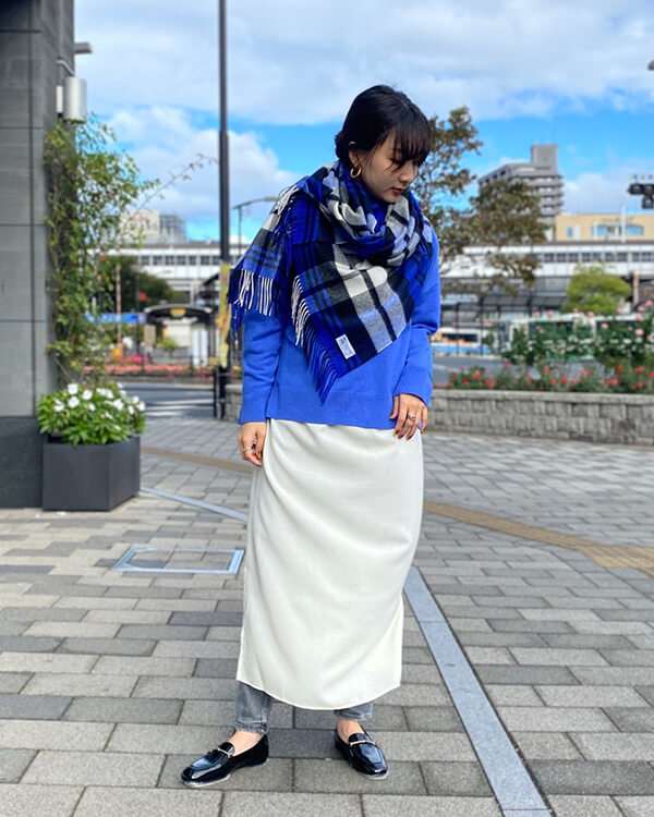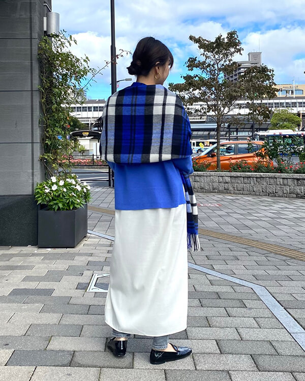 発色の良いカラーニットと柔らかな素材感のカシミヤストールの相性も抜群です。