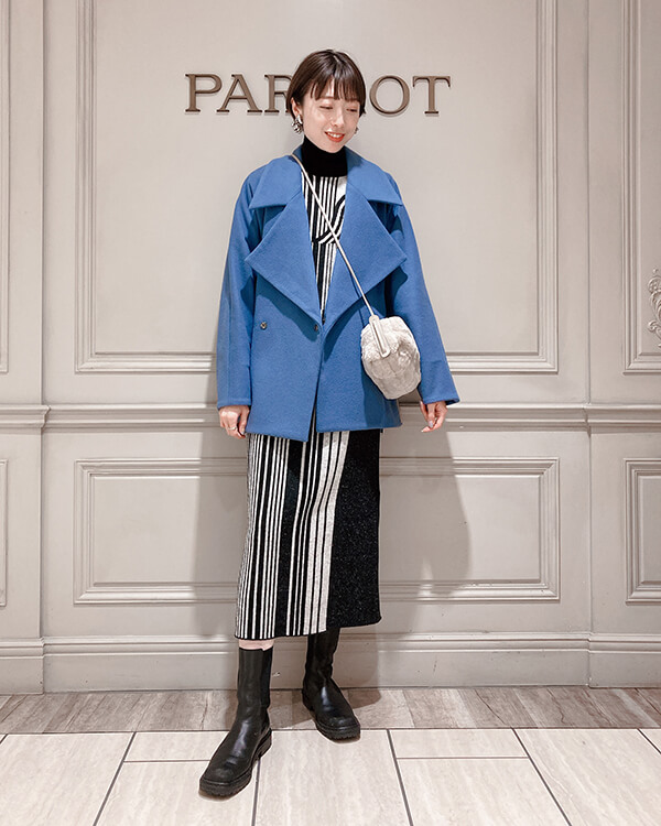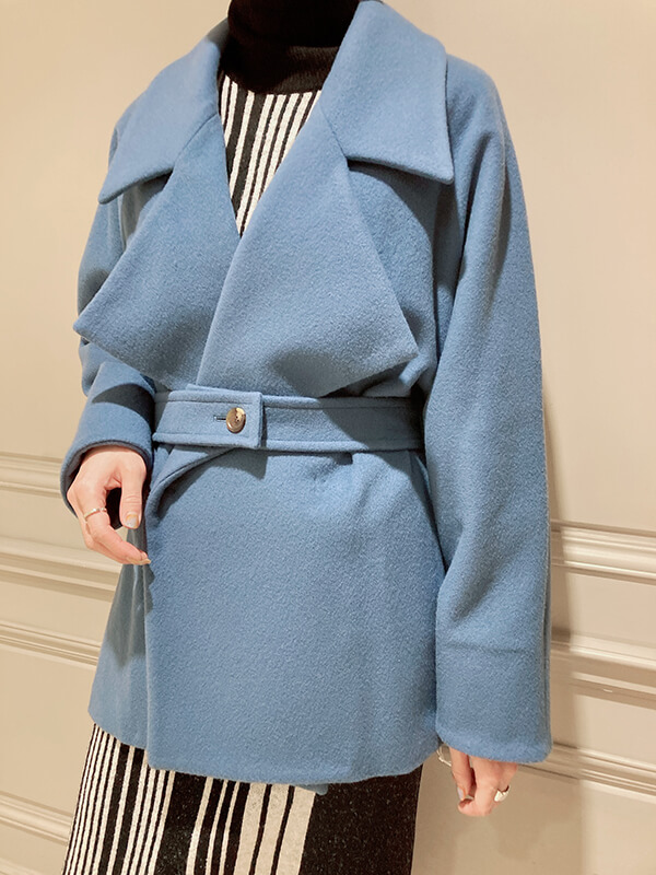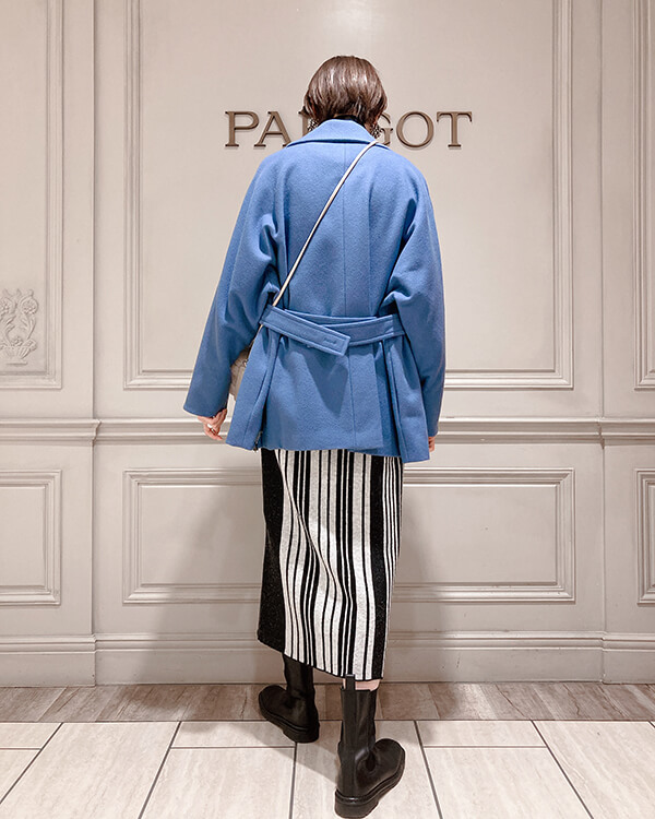 ターコイズブルーのようなきれいなブルーの色が目を引くVACHEMENTのベルテッドメルトンコートは、大きな襟が上半身に厚みをプラスしてくれて、かつドロップショルダーでゆったりとしたシルエットが寂しい印象にならず、ナチュラルさんも挑戦していただける形です★
