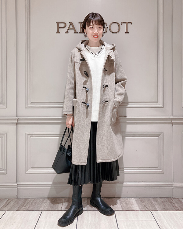 スタイリングに合わせたのは、フェイクレザーのプリーツスカート。子供っぽくなりがちなダッフルコートを辛口にして、大人が着れるカジュアルスタイルを。