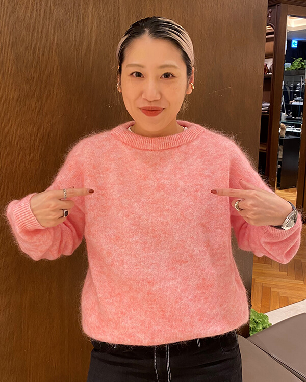 普段モノトーンが多いですが、去年から気になっていたのがピンクのニット。
