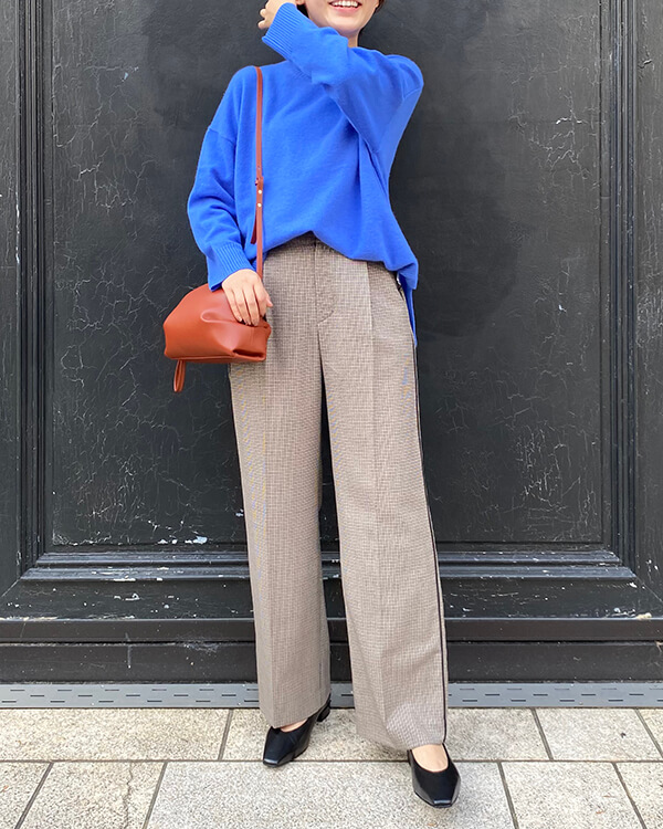 ニットにチェックパンツの冬の王道なスタイルですが、カラーが映えてこなれた印象になりますね!