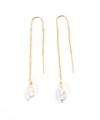 螺旋を描いたサークルパーツに、縦長のユニークな形のパールが耳元で揺れるピアス。