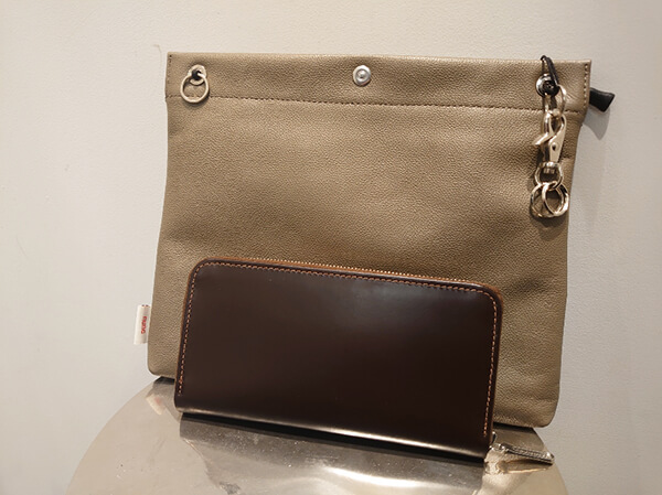 薄マチでかさばらないデザインですが、すっぽりと長財布とその他諸々も入れることができ、こちらはヘビーユースするにももってこいの丁度いいサイズ感です。