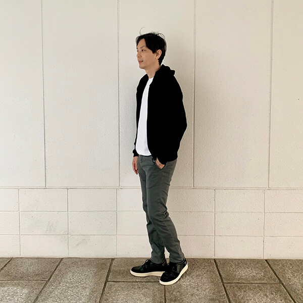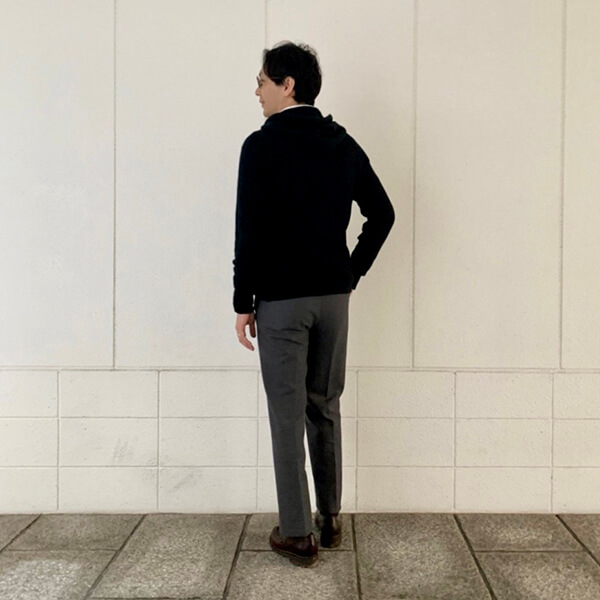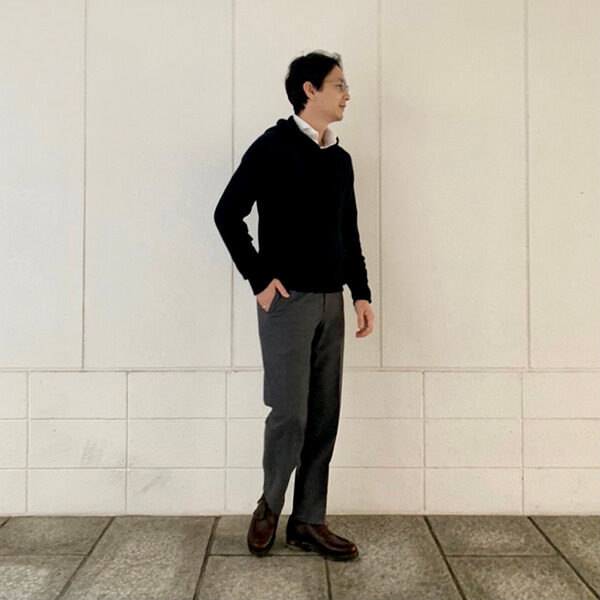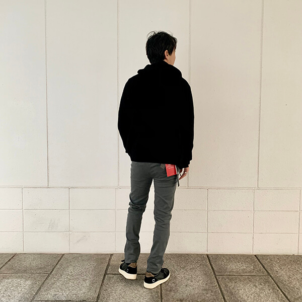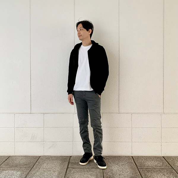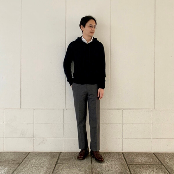 最後にボトムスとの合わせですが、スラックスはパーカーのカジュアル感をいい具合に中和してくれるので相性が良いです!