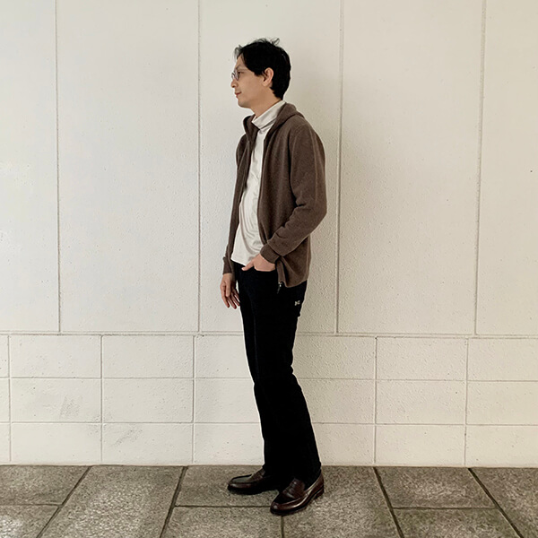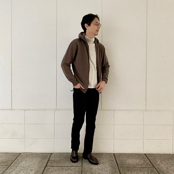 普段はクルーネックでシンプルに合わせるところをニットパーカーにすると、パーカー部分がアクセントになりより砕けた印象に。