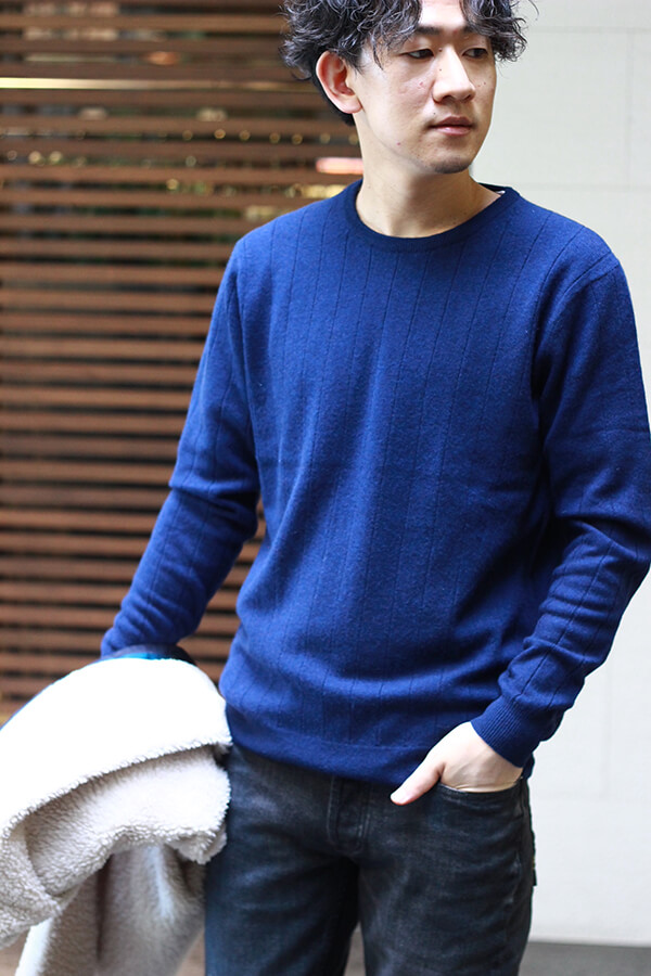 こちらのシャドーストライプニットは薄手な作りでカシミヤ混の生地となっており着心地が抜群なんです!