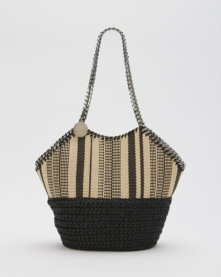 ミディアムトートのシーズナル素材ではストライプとラフィアコンビ。