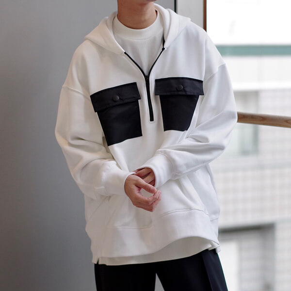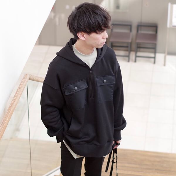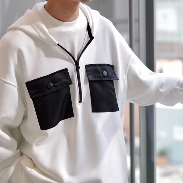 柔らかくふんわりとしたコットン素材で、胸元のサテン切り替えポケットとハーフジップとのバランスに、こだわりを感じる一着です。