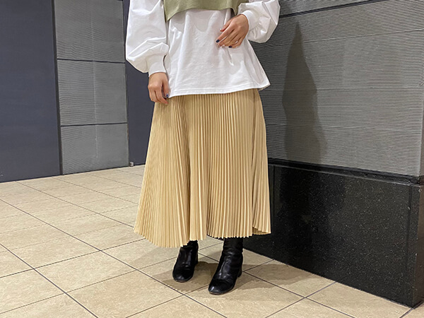 続いて、小柄さんもバランス良く着こなせるプリーツスカート。