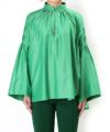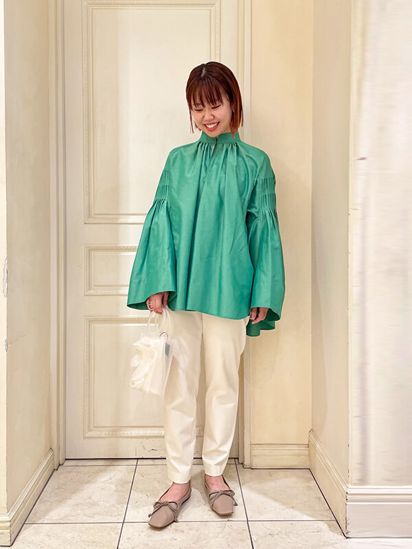 今季のトレンドカラーでもあるビビッドなグリーンが一枚で映えるこちらのブラウスはマメの新作です!