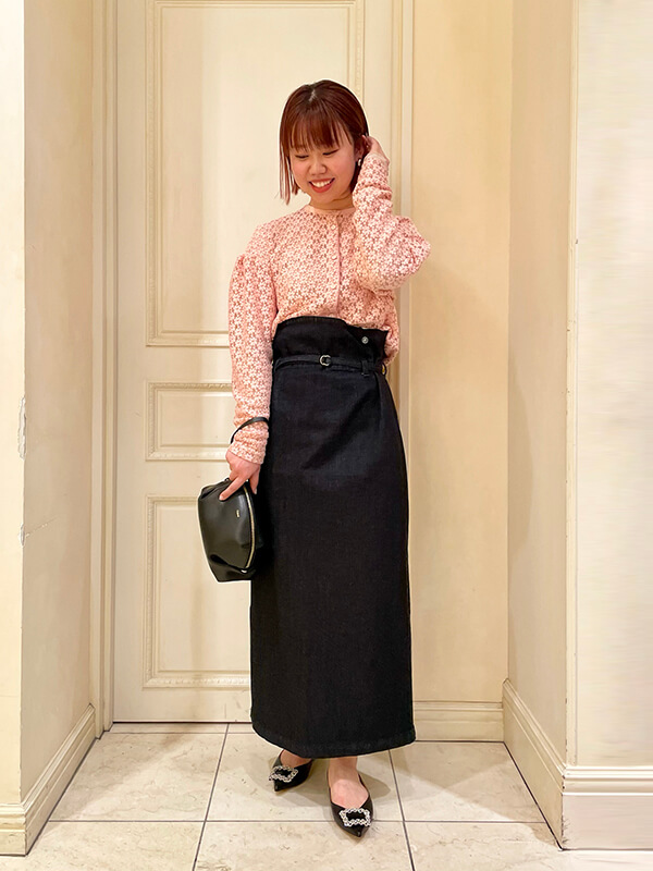 ウエスト位置を高く見せるためにハイウエストのタイトスカートで合わせました。