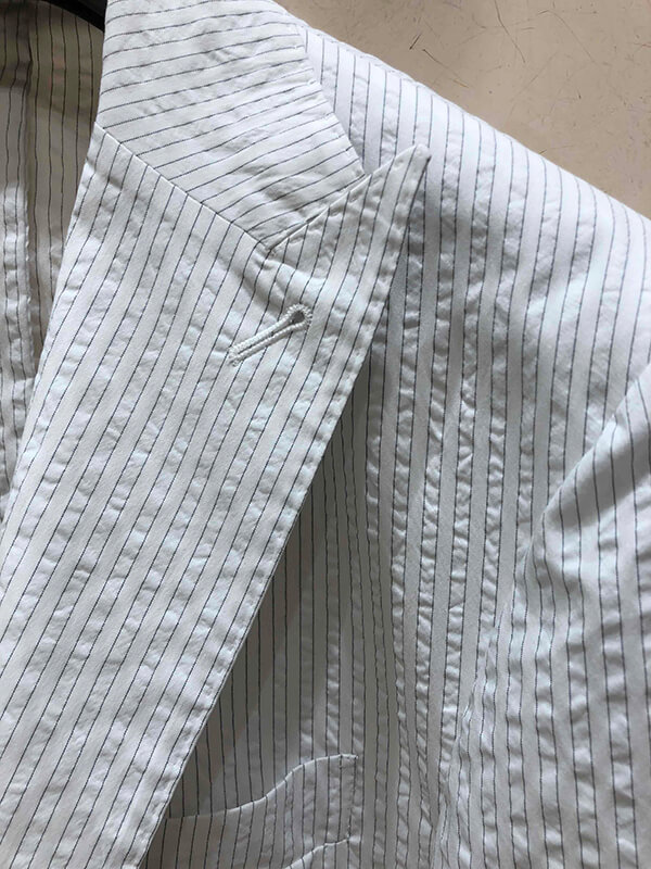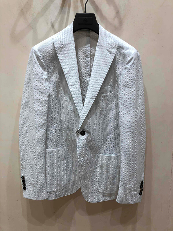 着用季節はもう少し先ですが、清涼感のあるシアサッカージャケットも、シングルピークドという変化球。