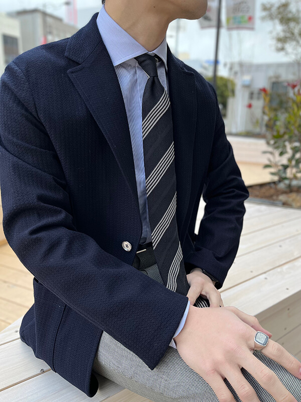 また、薄造りのメタルボタンを採用した事でブレザー感覚としても着用できる所もポイントです。