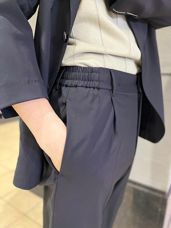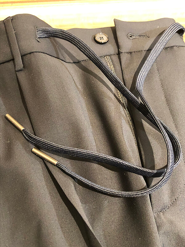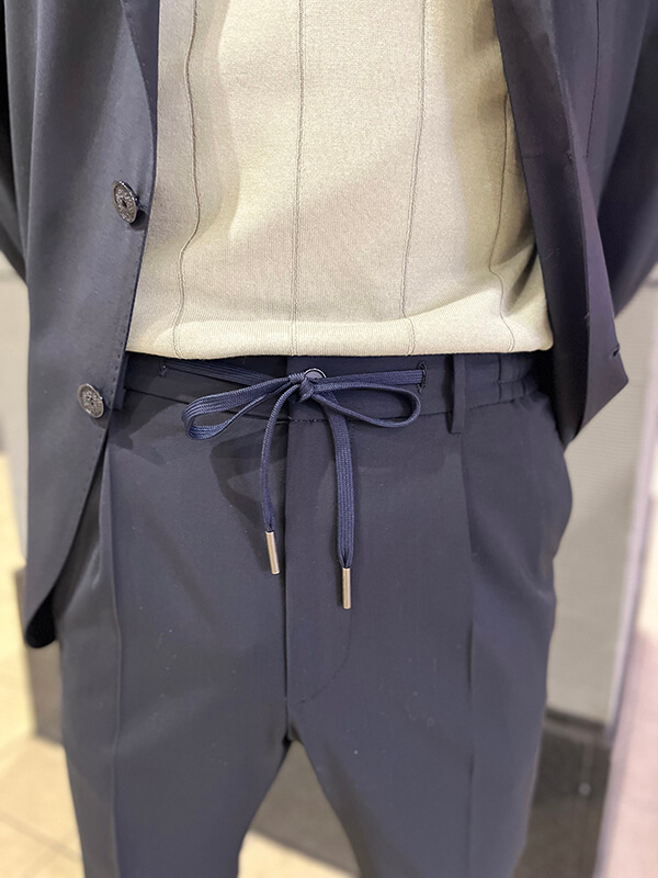 ウエストのドローコードは収納してベルト使用可能な仕様。イージーとドレッシーの両刀使いが可能です。