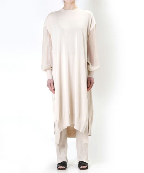 ハーフスリーブのニットにシフォンのスリーブをレイヤードしたようなデザインのニットアイテムは、トップスとワンピースが入荷。