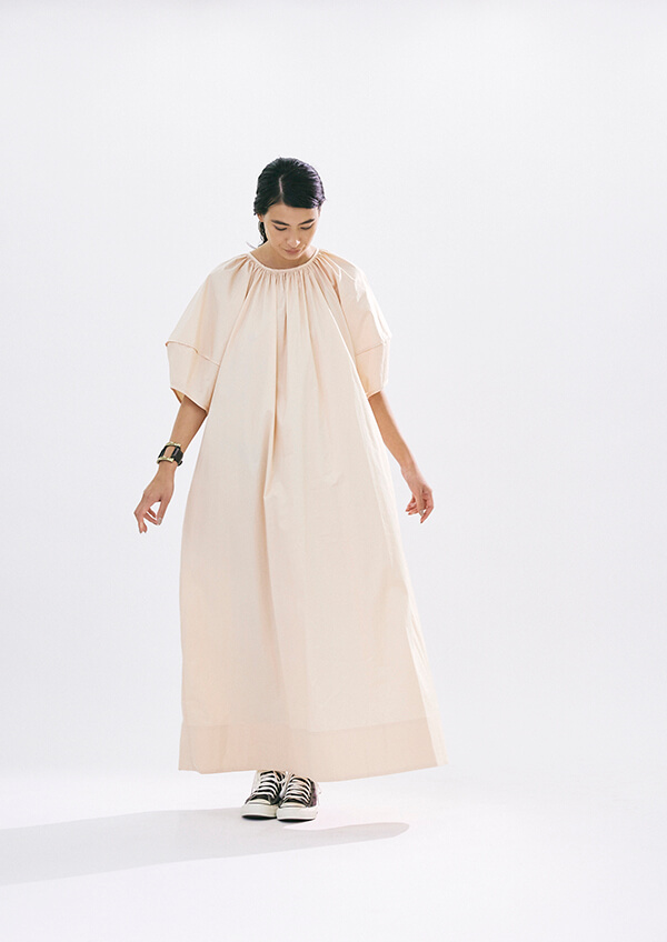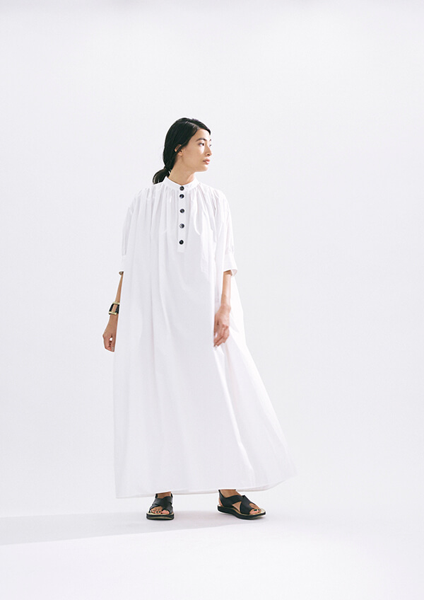 肩部分のギャザーと丸いボタンが特徴のコットンツイルワンピース。