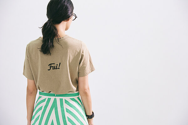 前後のフロッキーロゴTシャツは、デザイナーの遊び心が効いた1枚。