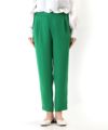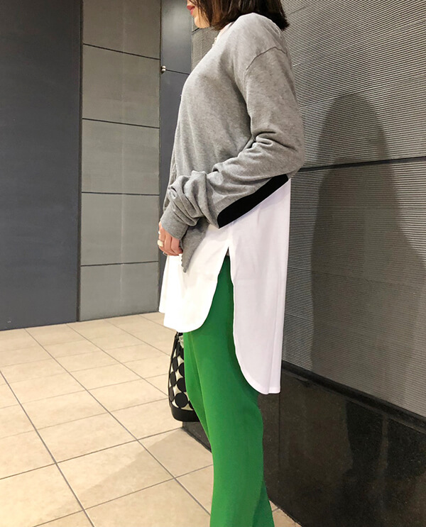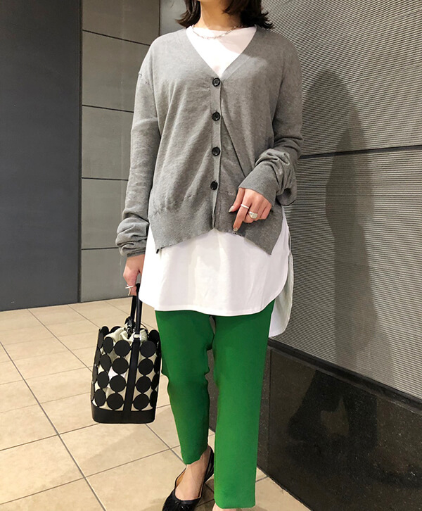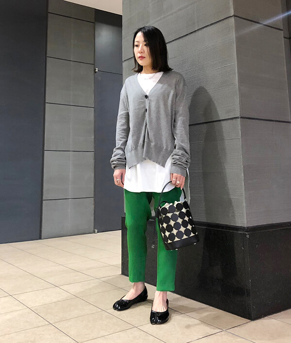 鮮やかなグリーンのパンツが目を引くコーディネートです。