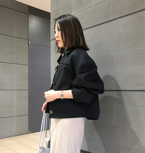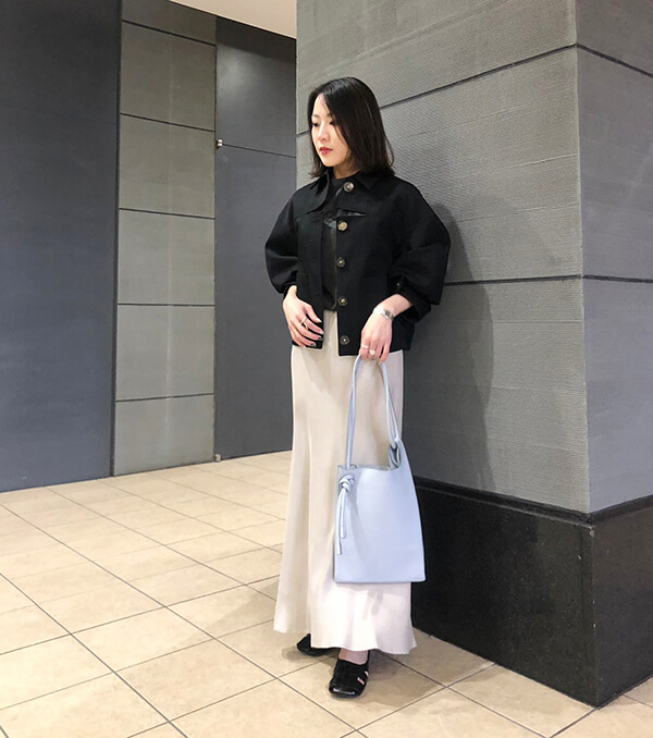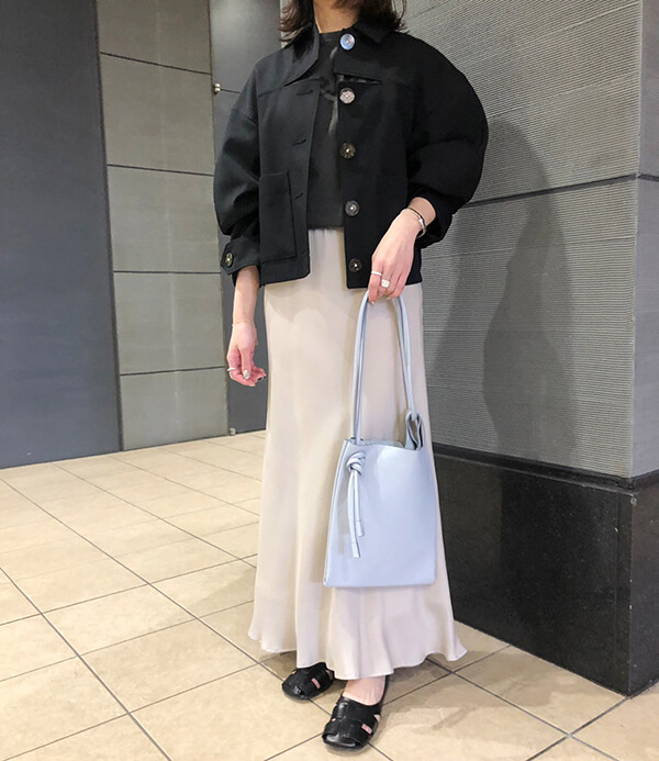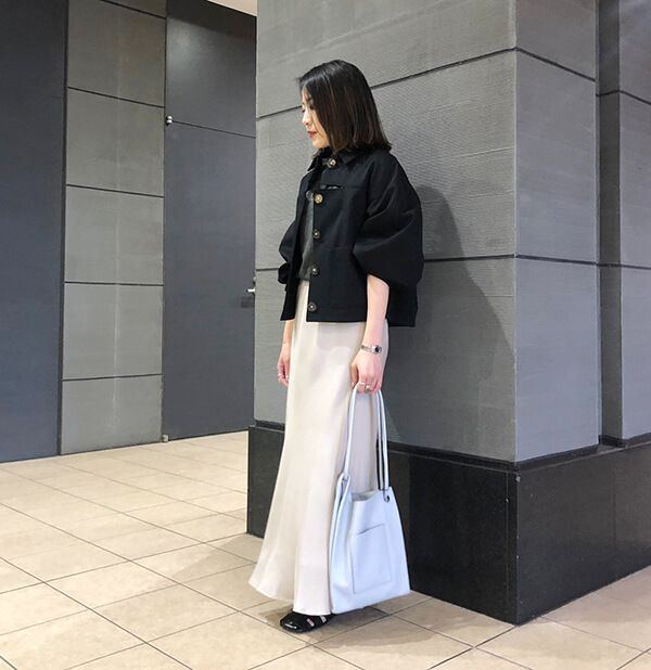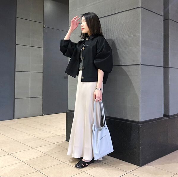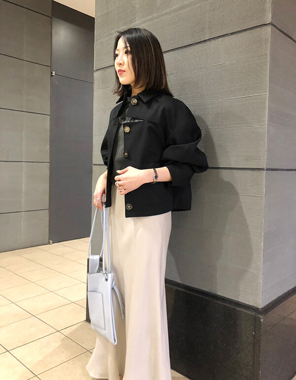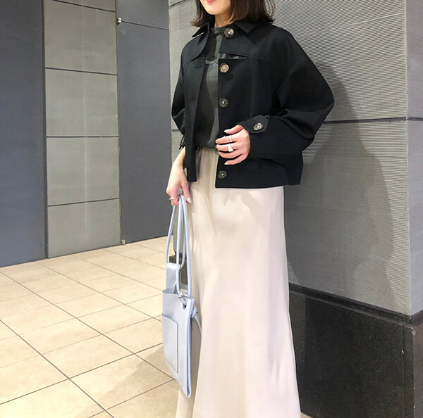 あえてメンズライクなジャケットを、サテンの艶と落ち感のあるシルエットが女性らしいスカートと合わせ、ミックス感のあるバランスで仕上げました!!
