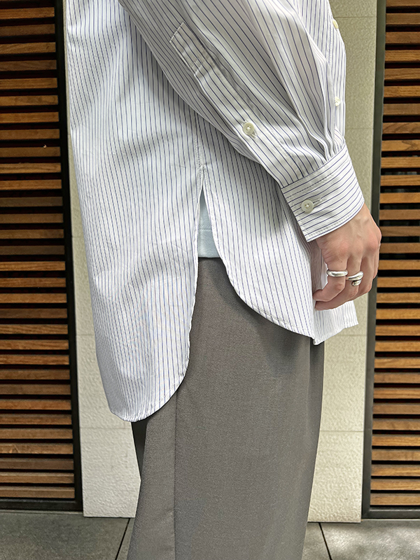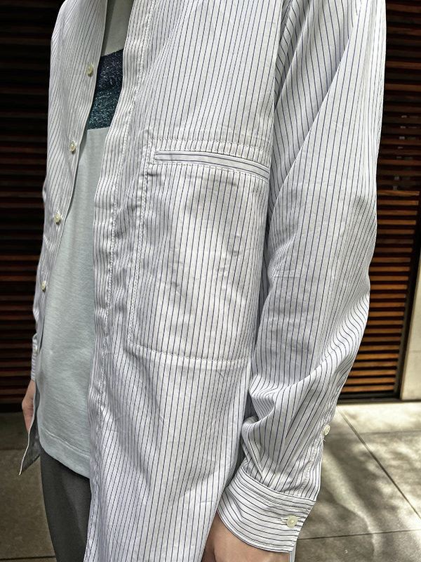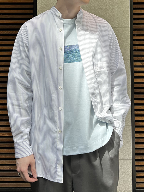 ストライプのバンドカラーシャツは清潔感抜群。レギュラーカラーのようにカチッとした印象もなく、程よく抜け感を演出してくれます。