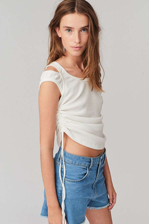 タンクトップはシンプルなデザインが多いですが、肩とサイドのシャーリング使いがポイント。