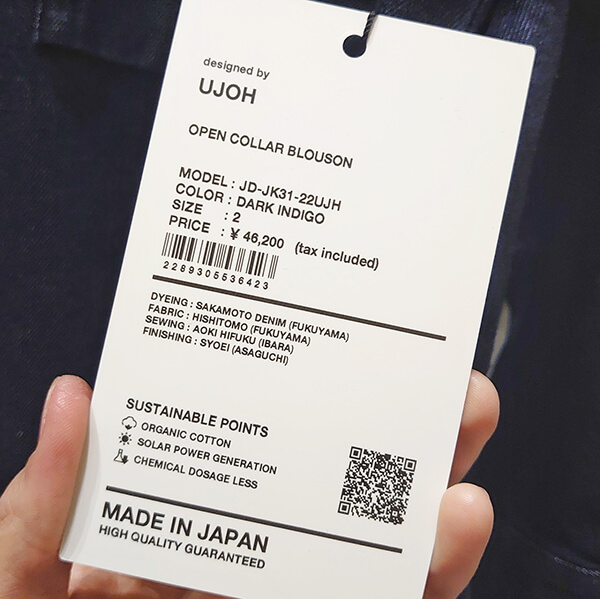 JAPAN DENIMは下げ札にトレーサビリティと、サスティナブルポイントというその商品を作る際に使用されている環境に配慮した加工技術も明記しております。