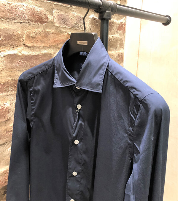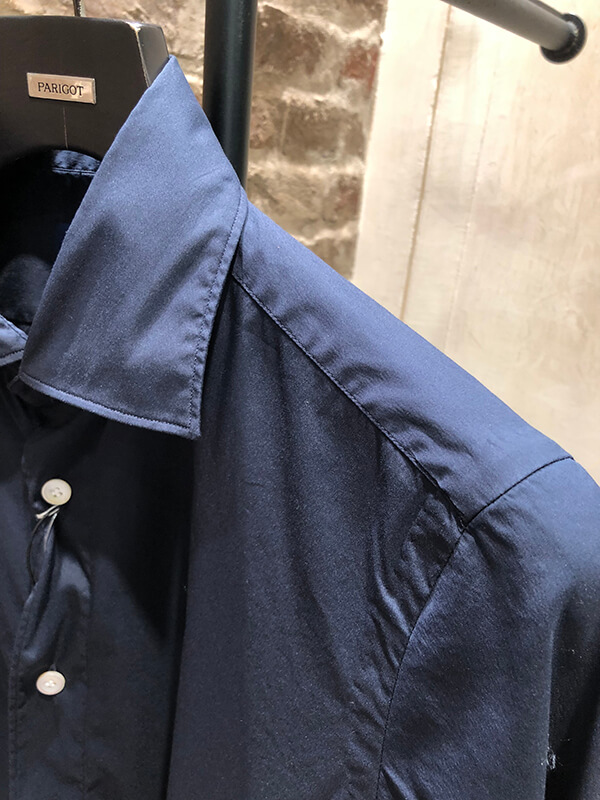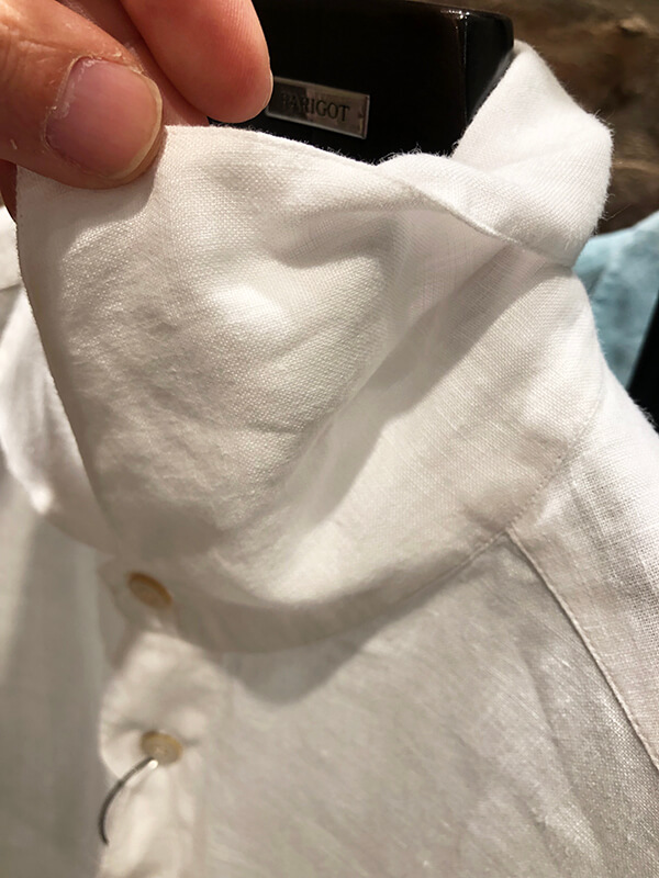他のブランドと違うのは本来なら襟先の中に芯を入れて形を整え、崩れにくくするのですが、Finamore(フィナモレ)はその襟先すらハンドで柔らかく仕上げ、尚且つふんわりと優しく跳ねる仕様にしてあり、副資材は使用されていません。
