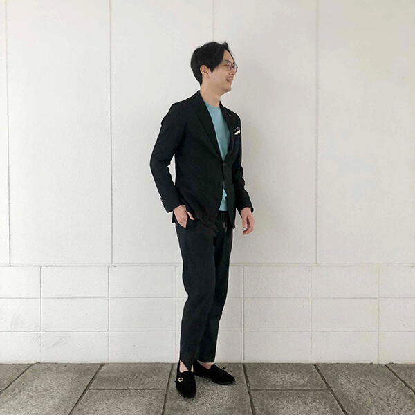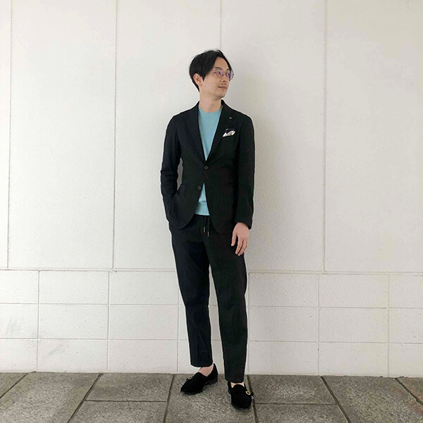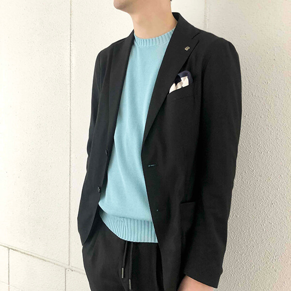 この様にブラックのセットアップのインナーに入れるだけで春の雰囲気に仕上げてくれるので、お勧めです。