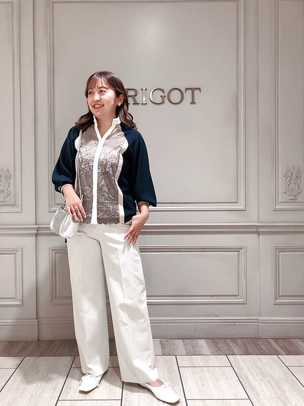 シーズンモチーフのボタニカルレースを胸元にあしらっているのですが、ベージュとホワイトの近い色合わせがさりげなくて可愛い♡