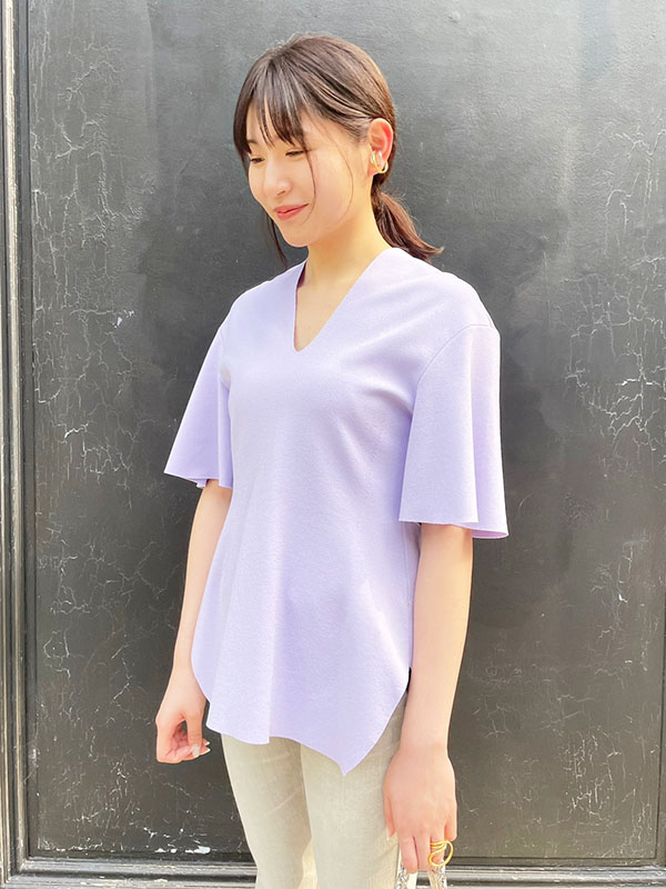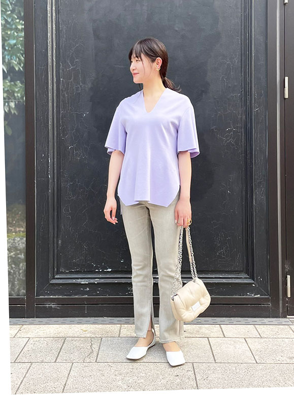 顔周りがすっきりした印象になるスキッパーデザインが骨格ストレートさんにぴったりな1枚です。