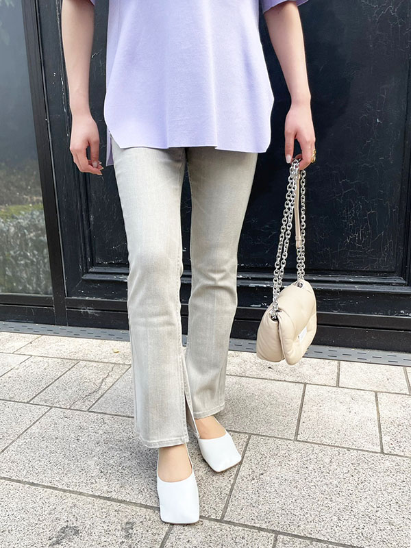 広がりすぎないスリットの入ったフレアデニムはトレンド感を取り入れつつ、すっきりまとめてくれます。
