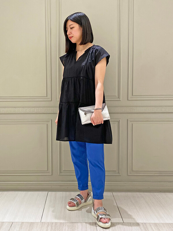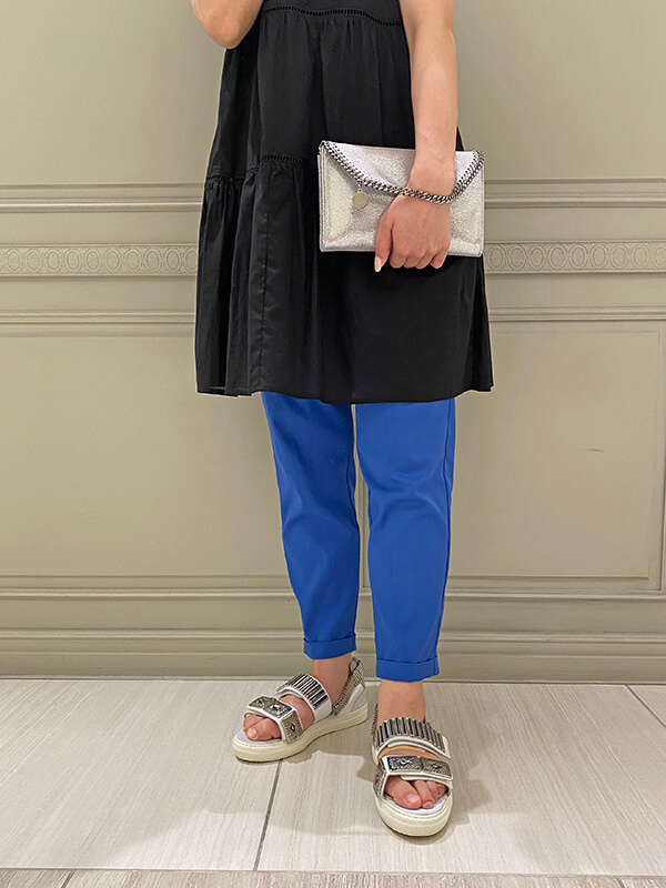 一見重たく見えがちな黒ですが、色物や光沢感のある涼しげな小物を取り入れることで夏らしく使いいただけます!