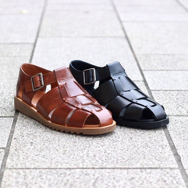 革に深みを出すために、メッシュ状に編み込んだヌメ革を手染めで仕上げるという、手間暇をかけて丁寧に作られた大人顔なレザーサンダルです。