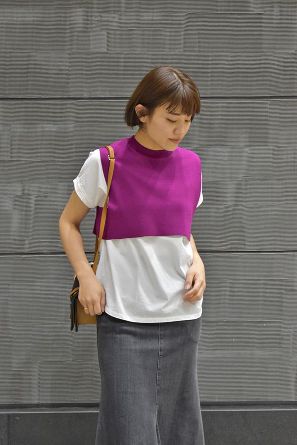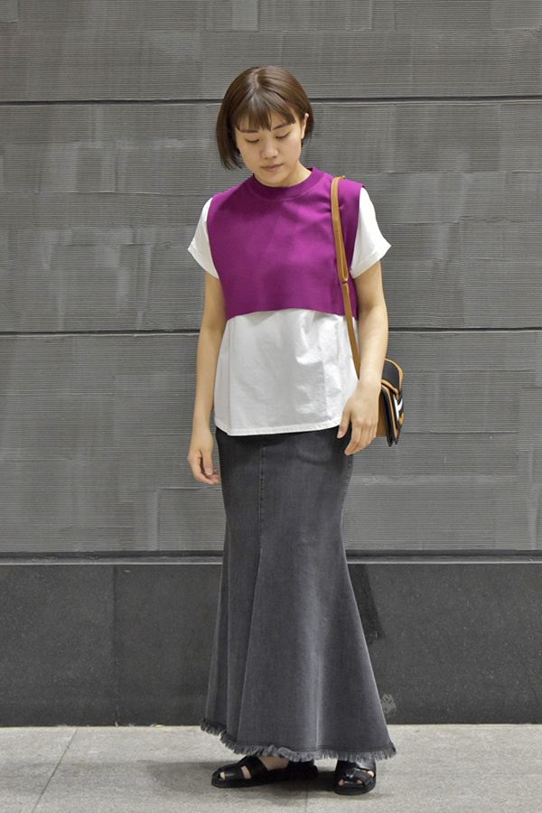 ベストと合わせてコーディネートを組んでみました。Tシャツはお尻が隠れるくらい丈が長めなので、あえて丈の短いベストなどをレイヤードするとお洒落見えしますね♪